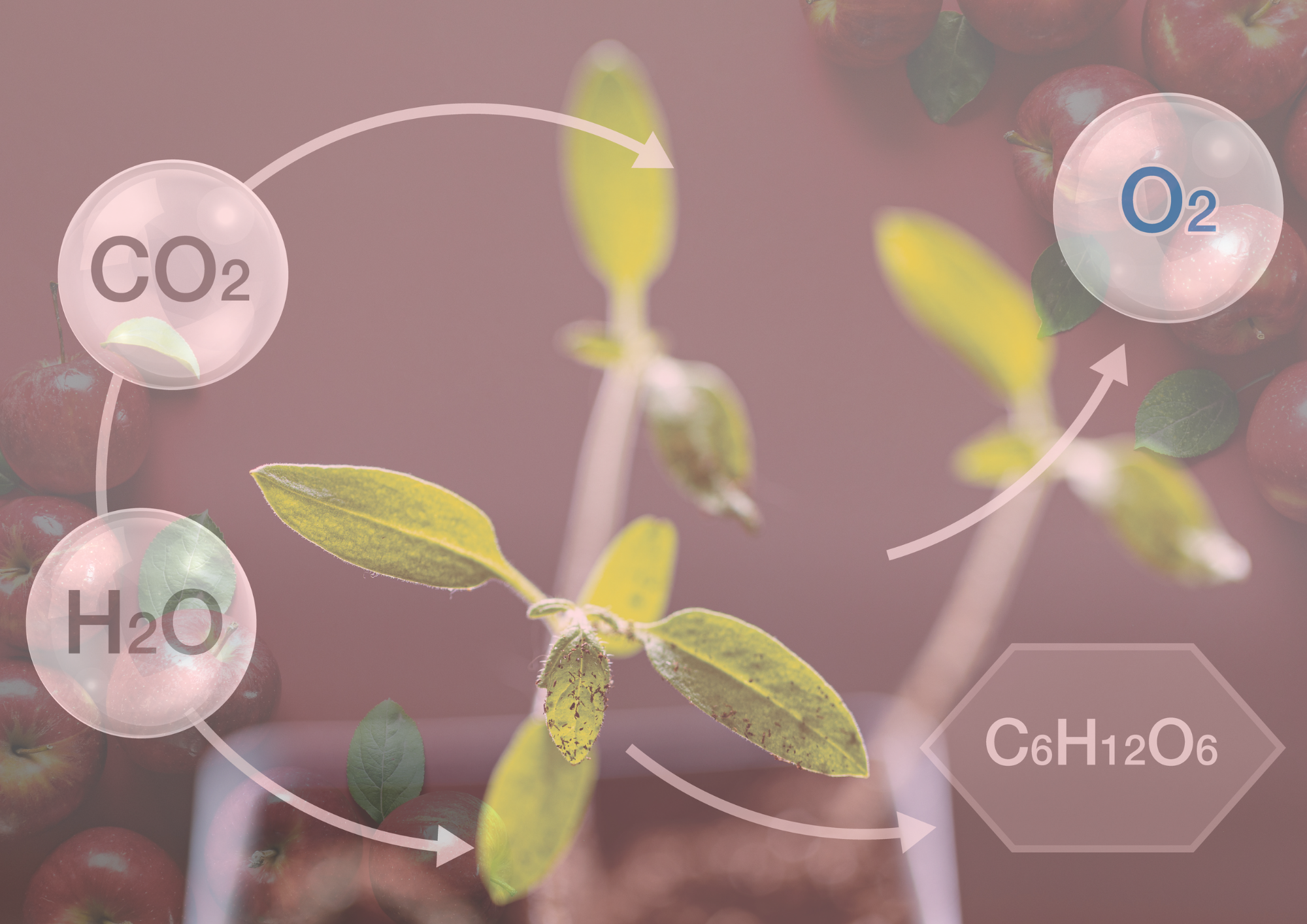 日中、リンゴの葉は太陽の光を受け、二酸化炭素と水からデンプンや糖を作り出します。